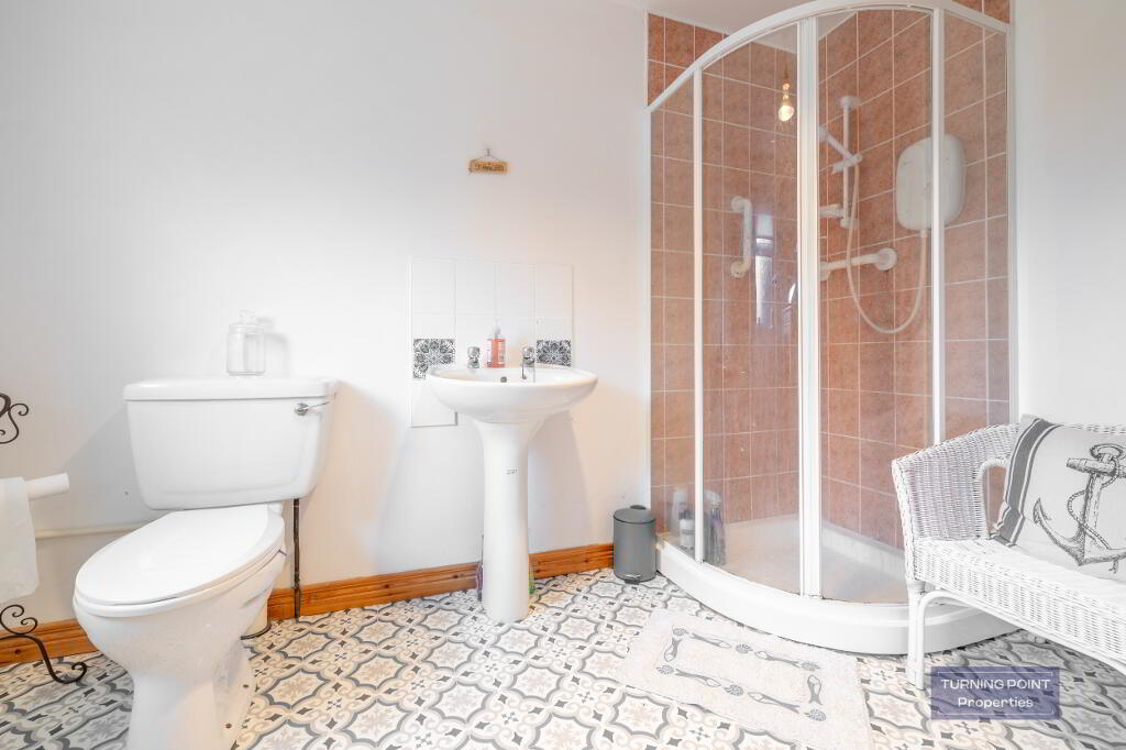 Low flush W.C. Wash hand basin. Electric shower. Lino floor. Partially tiled walls.
